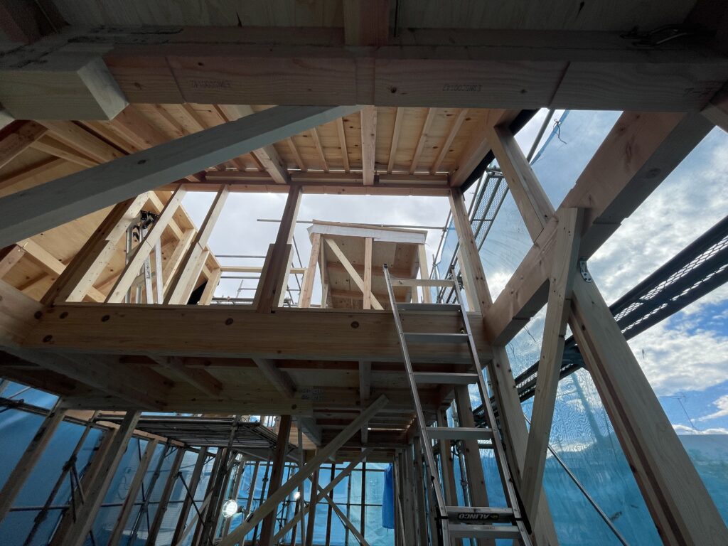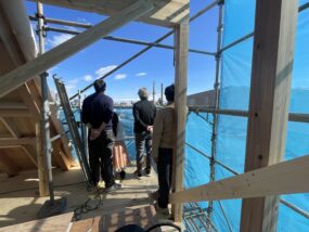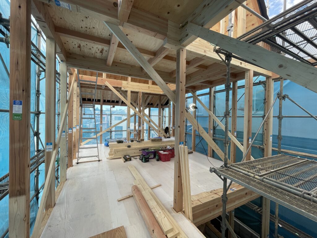 施主様と大工さんとの顔合わせをした後、骨組みの状態から室内となる空間を感じてもらいます。