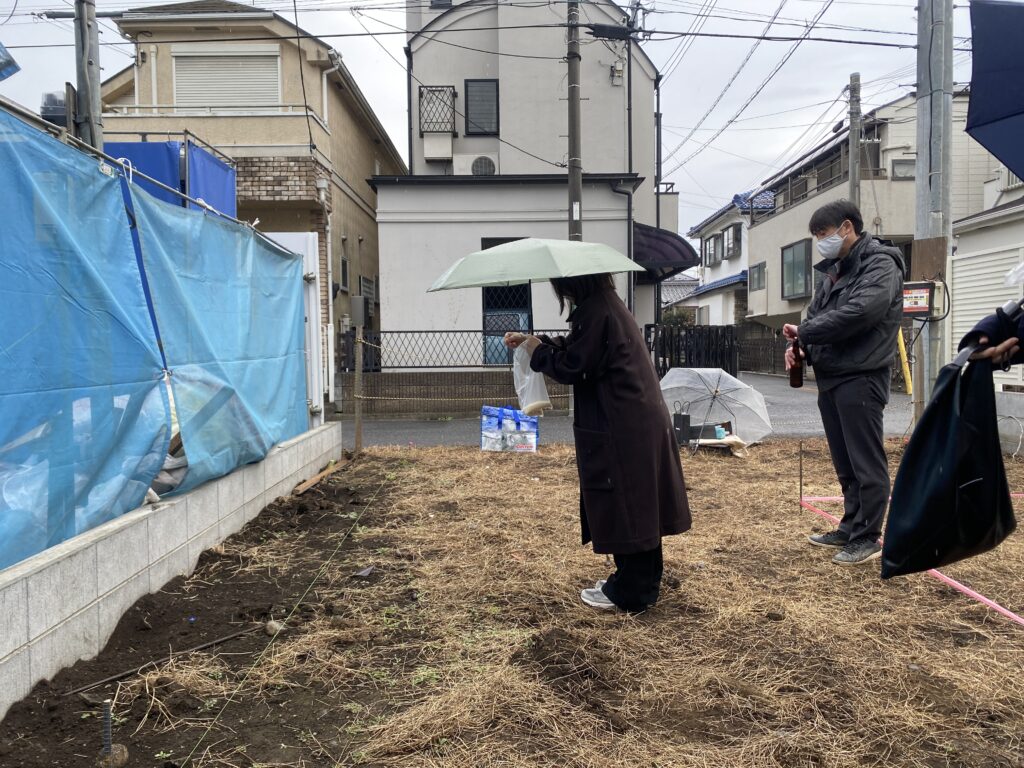 この日はお施主様、工務店さんと共に簡易的な地鎮祭を執り行いました。