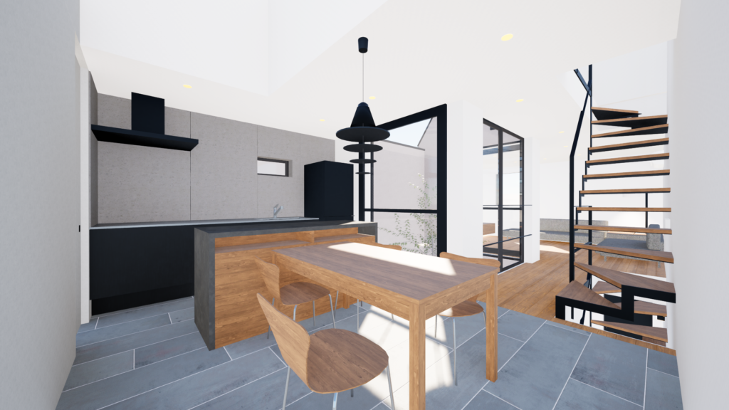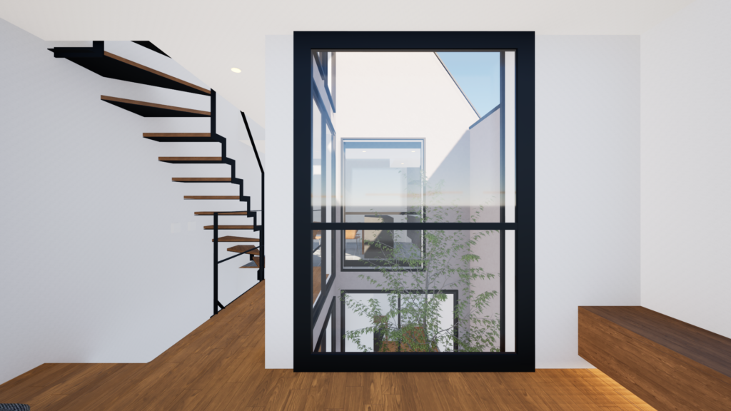 建物に囲まれた密集地という都市特有の条件の中で、“どうすれば心地よく暮らせるか” を丁寧に考え抜いた住まいです。