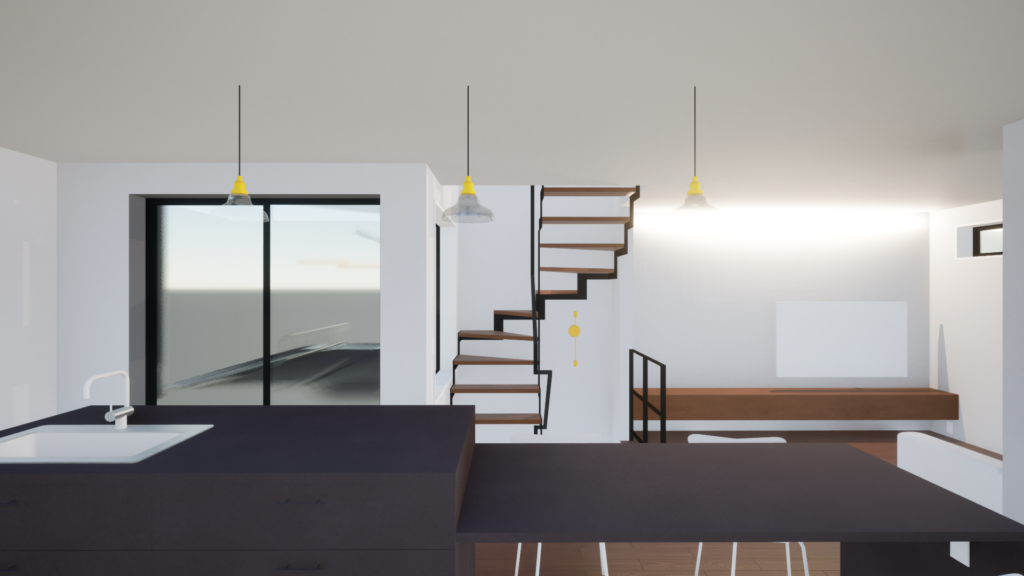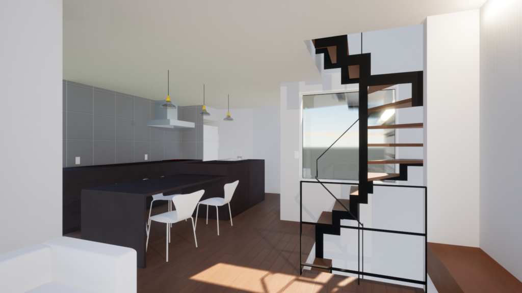 階段はスリットの鉄骨階段とし、LDKと階段室を壁で遮らないことで開放性を高めています。