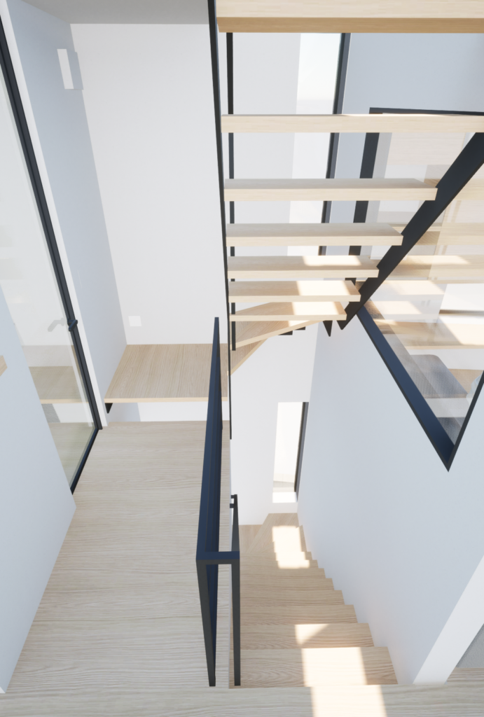 水廻り(1F)、LDK(2F)、寝室(3F)の三層構成で上層に行くごとに開放性を高めていき、3階には浦和の街を見渡せるバルコニーを配置、そしてその三層構造を縦に貫くように開放的な階段室を配置することで下階まで光を導きます。