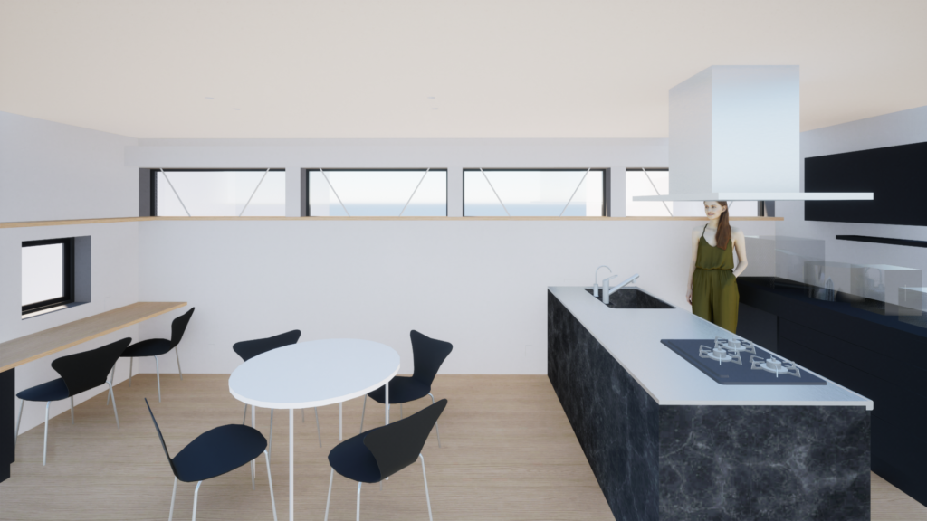 LDKの道路面は鋼製ブレースを用いることで開放性を持った構造とし、水平に連続したハイサイド窓を配することで、高密度な住宅地において明るさとプライバシー性を両立しています。